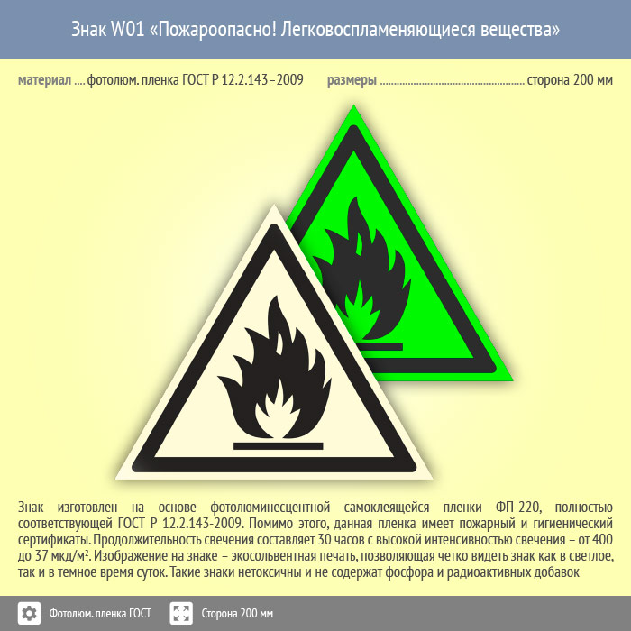 Знак W01 «Пожароопасно! легковоспламеняющиеся вещества» (фотолюминесцентная пленка ГОСТ 34428-2018, сторона 200 мм) в Сургуте купить