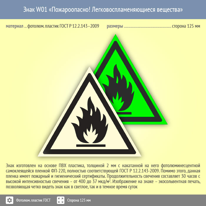 Знак W01 «Пожароопасно! Легковоспламеняющиеся вещества» (фотолюминесцентный пластик ГОСТ 34428-2018, сторона 125 мм) в Сургуте купить
