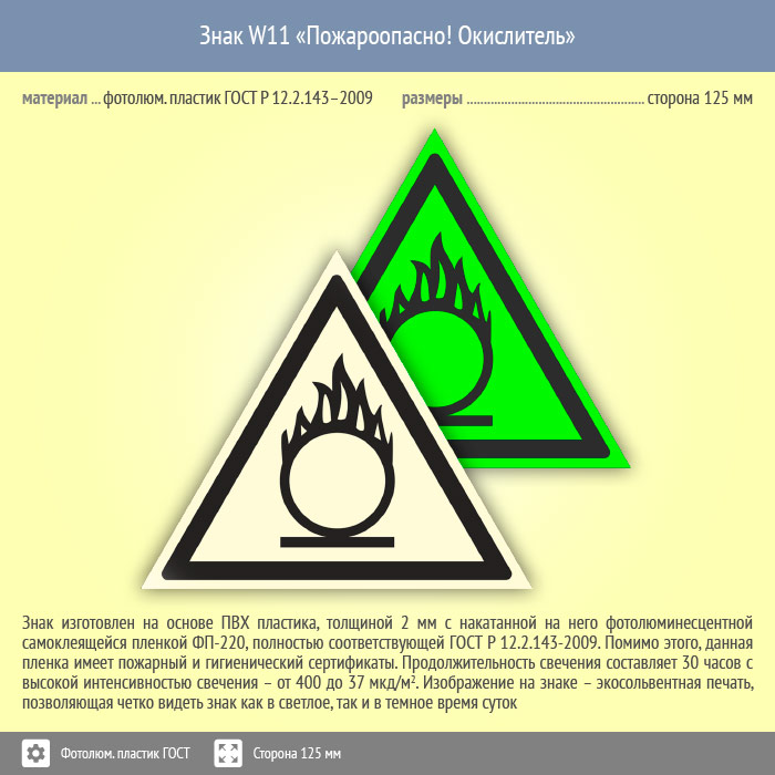 Знак W11 «Пожароопасно! Окислитель» (фотолюминесцентный пластик ГОСТ 34428-2018, сторона 125 мм) в Сургуте купить