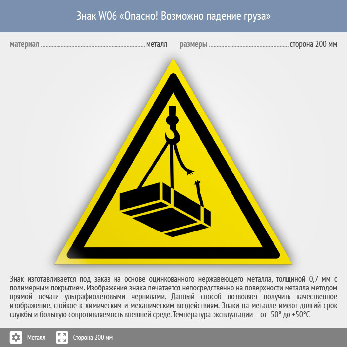 Знак W06 «Опасно! возможно падение груза» (металл, сторона 200 мм) в Сургуте купить