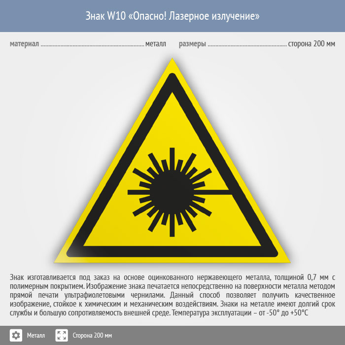 Знак W10 «Опасно! лазерное излучение» (металл, сторона 200 мм) в Сургуте купить