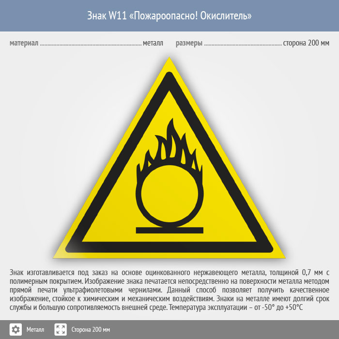 Знак W11 «Пожароопасно! окислитель» (металл, сторона 200 мм) в Сургуте купить