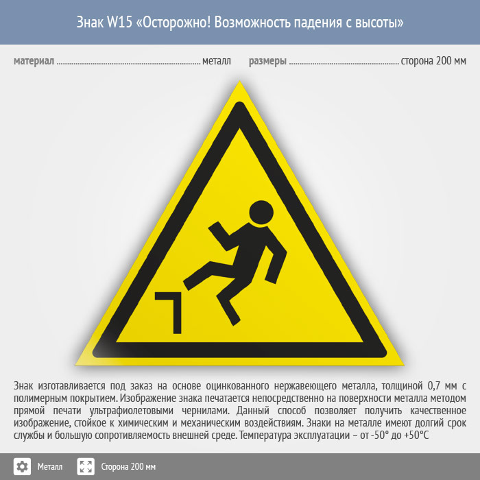 Знак W15 «Осторожно! возможность падения с высоты» (металл, сторона 200 мм) в Сургуте купить