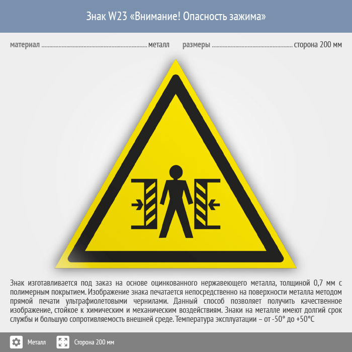 Знак W23 «Внимание! опасность зажима» (металл, сторона 200 мм) в Сургуте купить