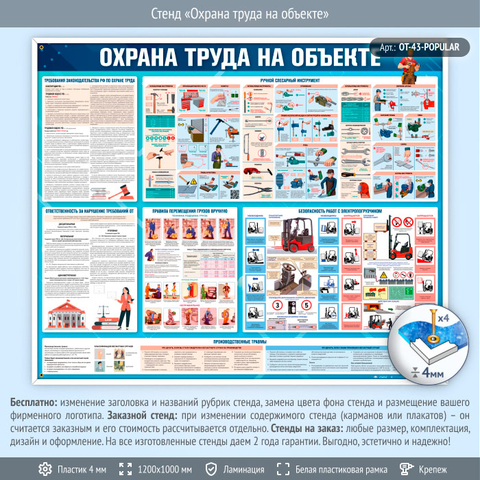Стенд «Охрана труда на объекте» (OT-43) содержит практическую информацию по охране труда при выполнении работ на производственных объектах. На стенде представлены требования законодательства, ответственность за их нарушение, правила безопасного использования ручного слесарного инструмента, перемещения грузов вручную и работы с электропогрузчиком. Также раскрыты темы предупреждения производственных травм, оформления несчастных случаев и классификации происшествий. Стенд способствует повышению уровня производственной безопасности и профилактике нарушений на рабочих местах.