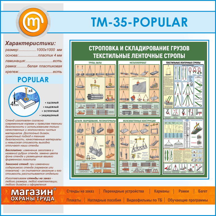 Стенд «Строповка и складирование грузов. Текстильные ленточные стропы» (TM-35-POPULAR)