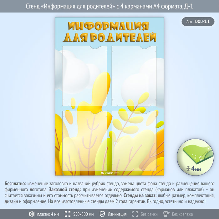 Стенд «Информация для родителей» с 4 карманами А4 формата (DOU-1.1) в Сургуте купить
