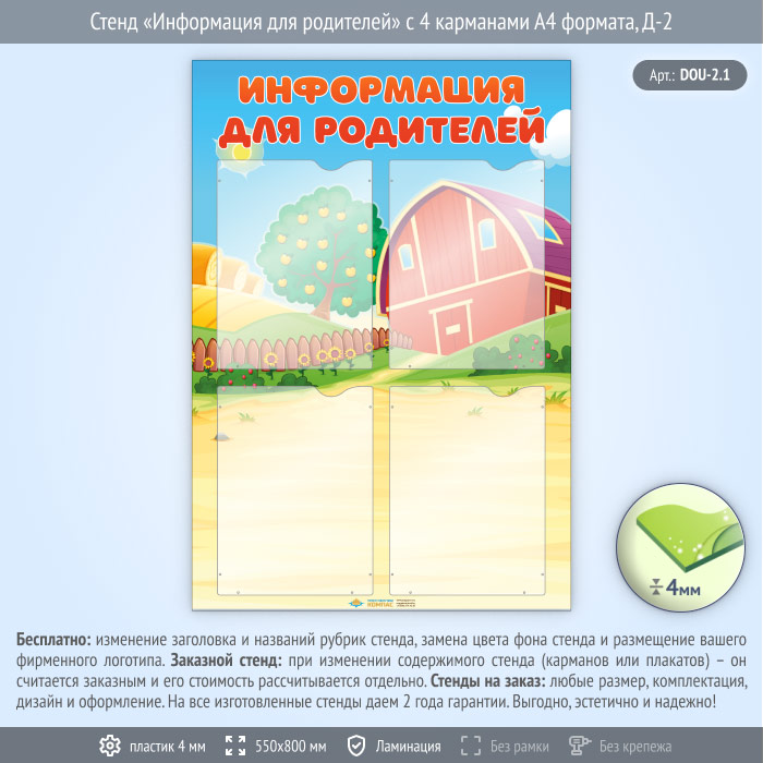 Стенд «Информация для родителей» с 4 карманами А4 формата (DOU-2.1) в Сургуте купить