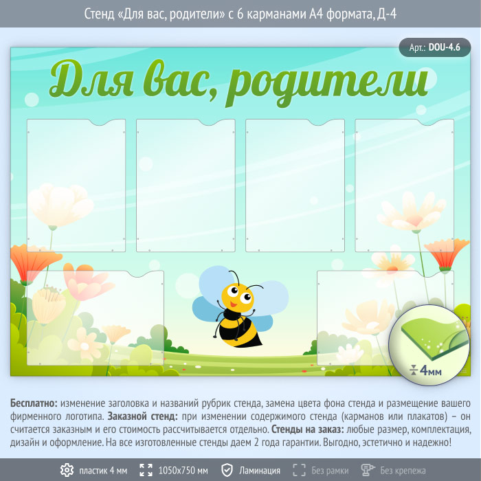 Стенд «Для вас, родители» с 6 карманами А4 формата (DOU-4.6) в Сургуте купить