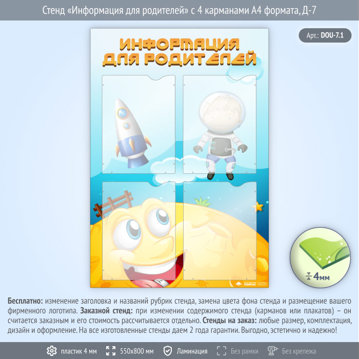 Стенд «Информация для родителей» с 4 карманами А4 формата (DOU-7.1) в Сургуте купить