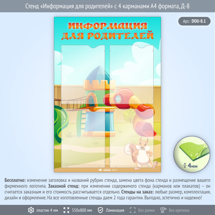 Стенд «Информация для родителей» с 4 карманами А4 формата (DOU-8.1) в Сургуте купить