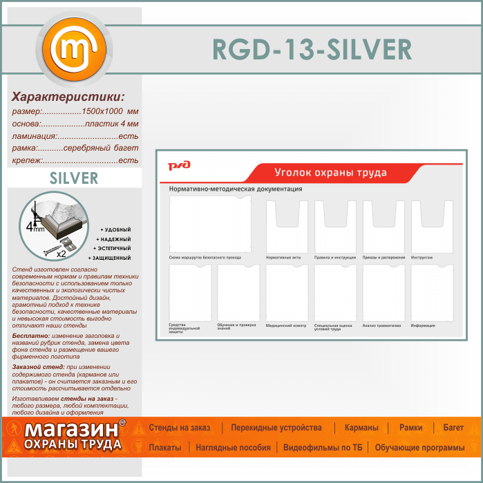 Стенд «Уголок охраны труда» с 1 плоским карманом А3 формата, 6 плоскими и 4 объемными карманами А4 формата (RGD-13-SILVER) в Сургуте купить