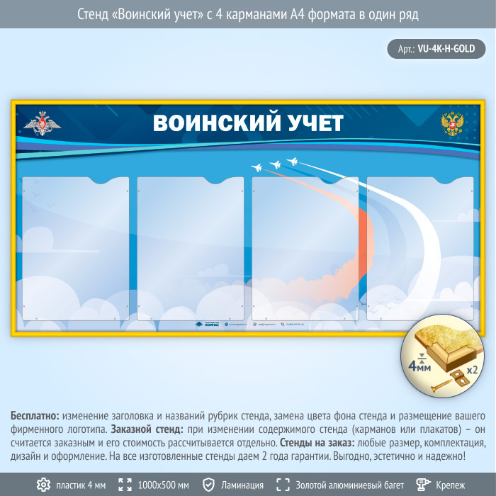Стенд «Воинский учет» с 4 карманами А4 формата в один ряд (VU-4K-H-GOLD) в Сургуте купить
