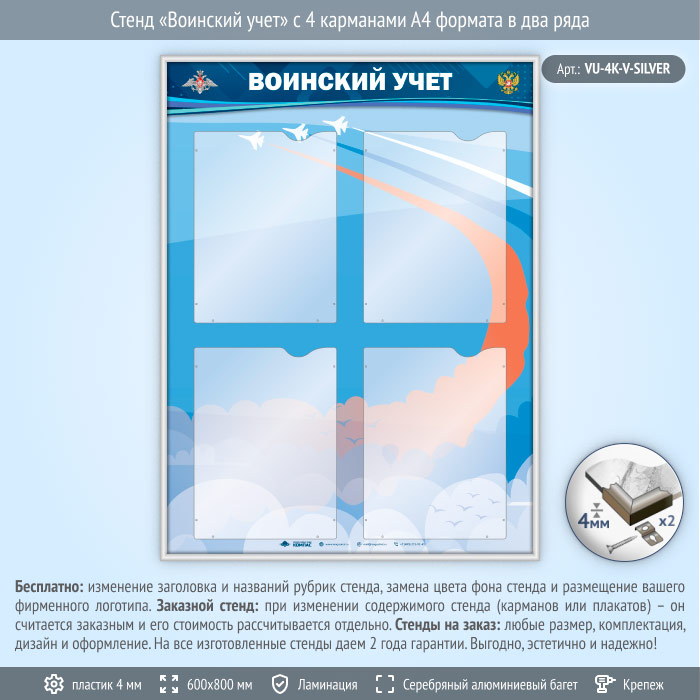 Стенд «Воинский учет» с 4 карманами А4 формата в два ряда (VU-4K-V-SILVER) в Сургуте купить