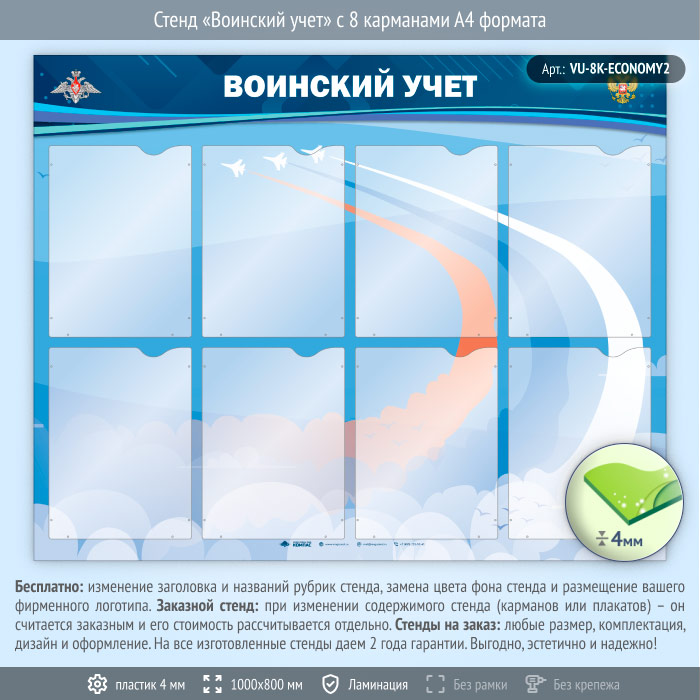 Стенд «Воинский учет» с 8 карманами А4 формата (VU-8K-ECONOMY2) в Сургуте купить