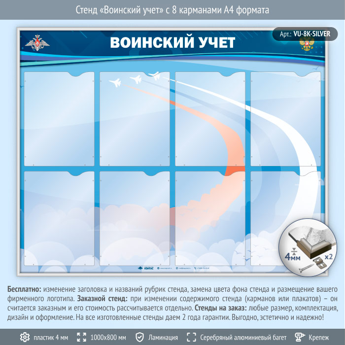 Стенд «Воинский учет» с 8 карманами А4 формата (VU-8K-SILVER) в Сургуте купить