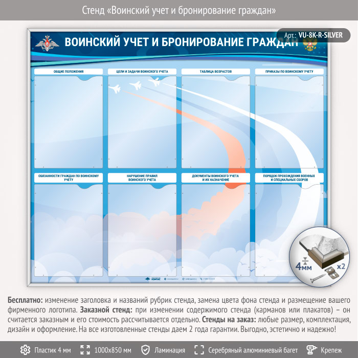 Стенд «Воинский учет и бронирование граждан» с 8 карманами А4 формата (VU-8K-R-SILVER) в Сургуте купить