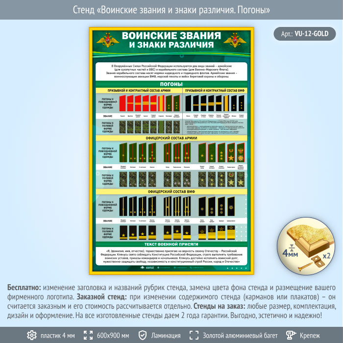 Стенд «Воинские звания и знаки различия. Погоны» (VU-12-GOLD) в Сургуте купить