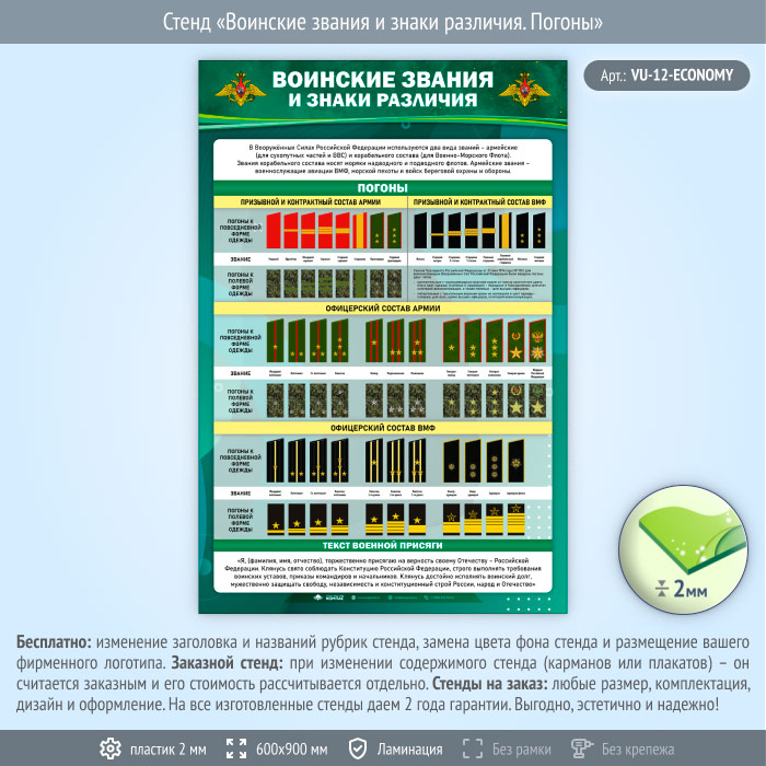 Стенд «Воинские звания и знаки различия. Погоны» (VU-12-ECONOMY) в Сургуте купить