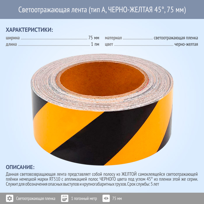 Светоотражающая сигнальная лента (тип А, ЧЕРНО-ЖЕЛТАЯ 45°, 75 мм х 1 п.м.) в Сургуте купить