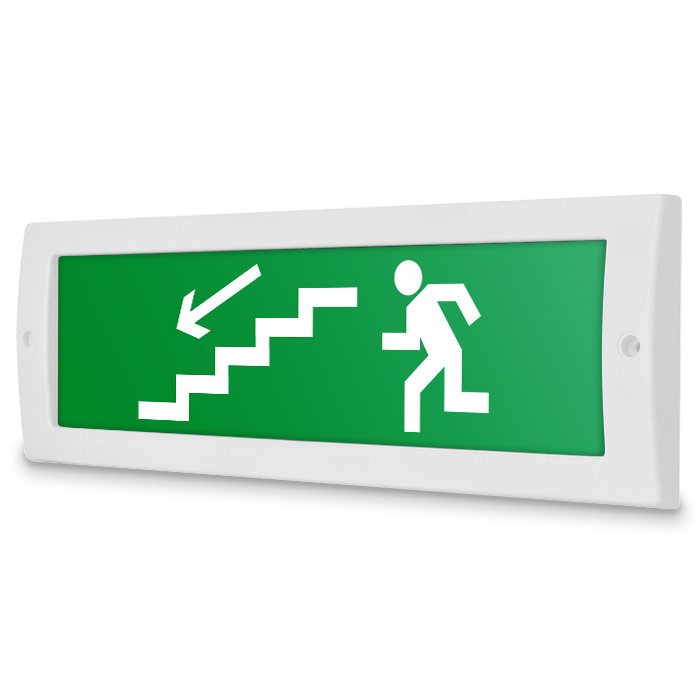 Световое табло «Направление к эвакуационному выходу по лестнице вниз (левосторонний)», Молния (12В) в Сургуте купить
