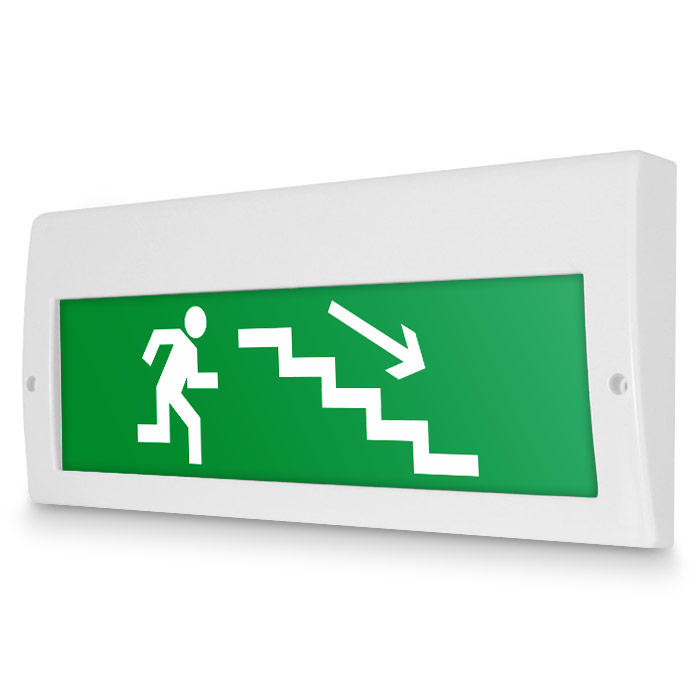 Световое табло «Направление к эвакуационному выходу по лестнице вниз (правосторонний)», Молния (220В РИП) в Сургуте купить