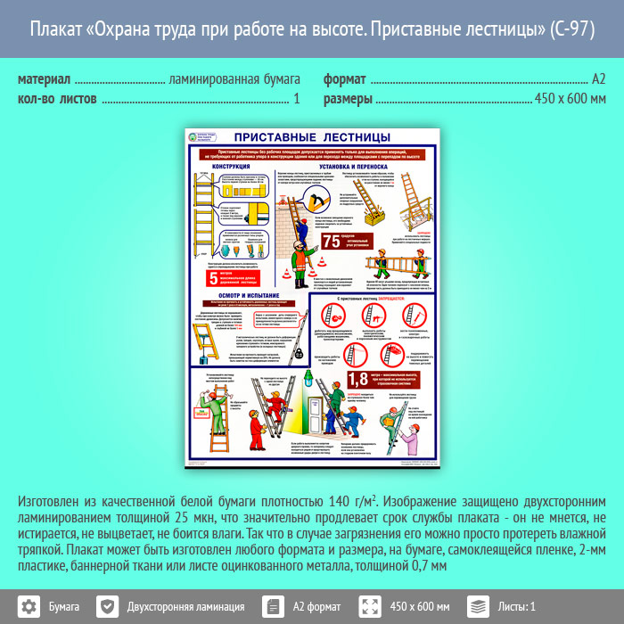 Плакат «Охрана труда при работе на высоте. Приставные лестницы» (С-97, ламинированная бумага, А2, 1 лист) в Сургуте купить
