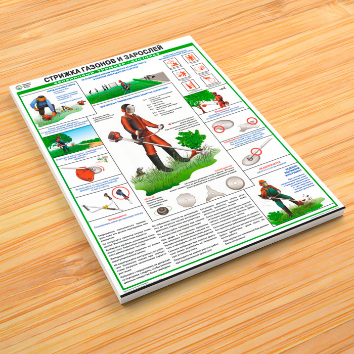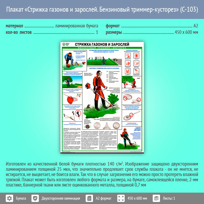 Плакат «Стрижка газонов и зарослей. Бензиновый триммер-кусторез» (С-103, ламинированная бумага, А2, 1 лист) в Сургуте купить