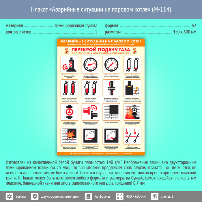 Плакат «Аварийные ситуации на паровом котле» (М-114, ламинированная бумага, А2, 1 лист) в Сургуте купить