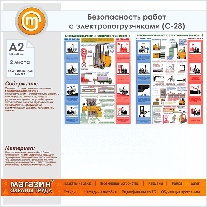 Плакаты «Безопасность работ с электропогрузчиками» (С-28, ламинированная бумага, А2, 2 листа) в Сургуте купить