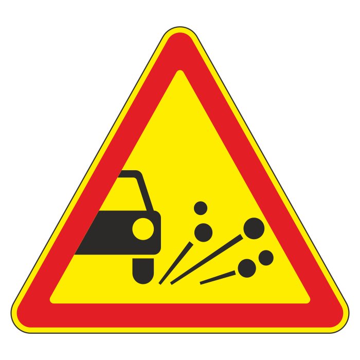 Дорожный знак 1.18 «Выброс гравия» (временный) (металл 0,8 мм, III типоразмер: сторона 1200 мм, С/О пленка: тип А коммерческая) в Сургуте купить