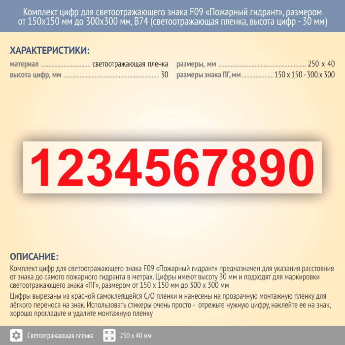 Комплект цифр для светоотражающего знака F09 «Пожарный гидрант», размером от 150х150 мм до 300х300 мм, В74 (светоотражающая пленка, 250х40 мм, высота цифр - 30 мм) в Сургуте купить