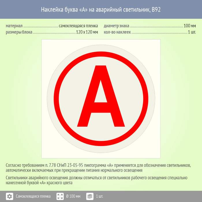 Наклейка буква «А» на аварийный светильник, B92 (пленка, диаметр 100 мм, 120х120 мм) в Сургуте купить