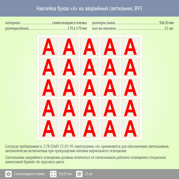 Наклейка буква «А» на аварийный светильник, B93 (пленка, 30х30 мм, блок 25 штук, 170х170 мм) в Сургуте купить