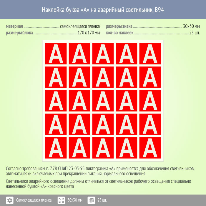 Наклейка буква «А» на аварийный светильник, B94 (пленка, 30х30 мм, блок 25 штук, 170х170 мм) в Сургуте купить