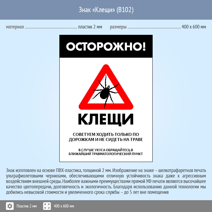 Знак «Осторожно! Клещи», B102 (пластик, 300х400 мм) в Сургуте купить