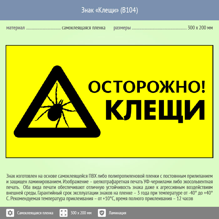 Знак «Осторожно! Клещи», B104 (пленка c ламинированием, 400х300 мм) в Сургуте купить