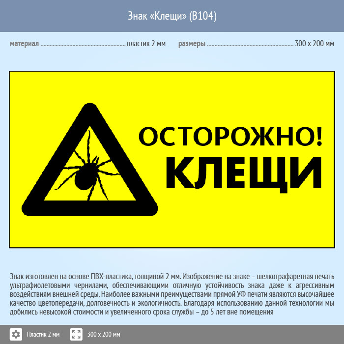 Знак «Осторожно! Клещи», B104 (пластик, 400х300 мм) в Сургуте купить