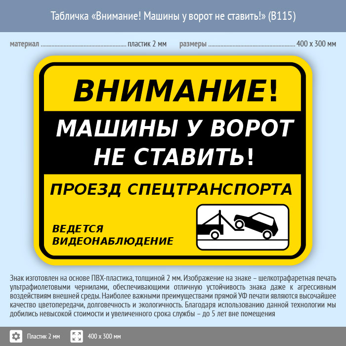 Табличка «Внимание! Машины у ворот не ставить!», B115 (пластик, 400х300 мм) в Сургуте купить