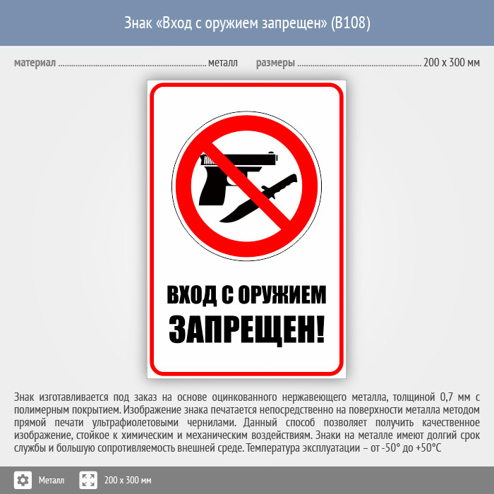 Знак «Вход с оружием запрещен», B108 (металл, 200х300 мм) в Сургуте купить