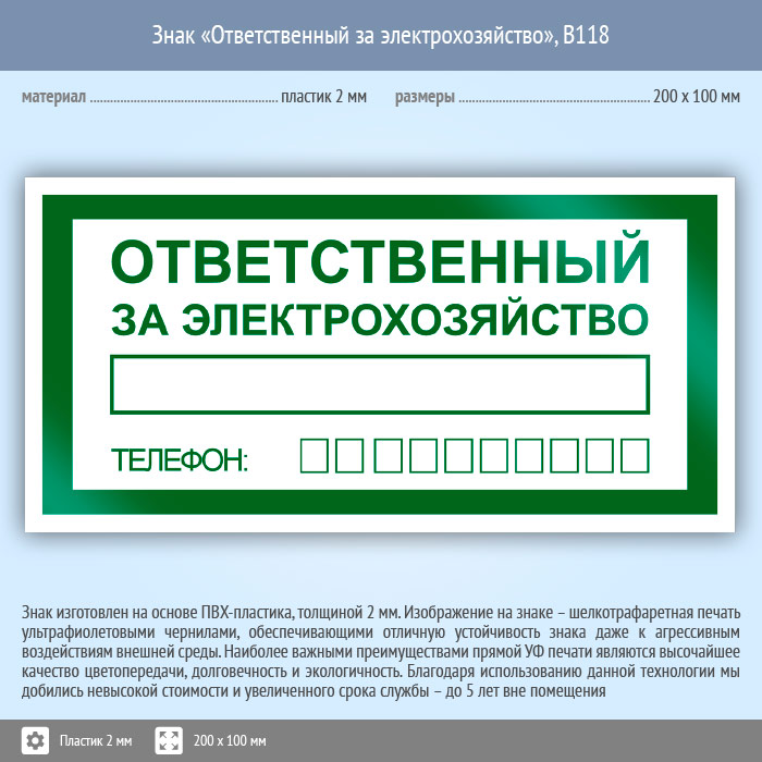 Знак «Ответственный за электрохозяйство», B118 (пластик, 200х100 мм) в Сургуте купить