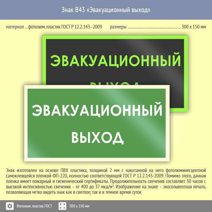 Знак B43 «Эвакуационный выход» (фотолюминесцентный пластик ГОСТ 34428-2018, 300х150 мм) в Сургуте купить