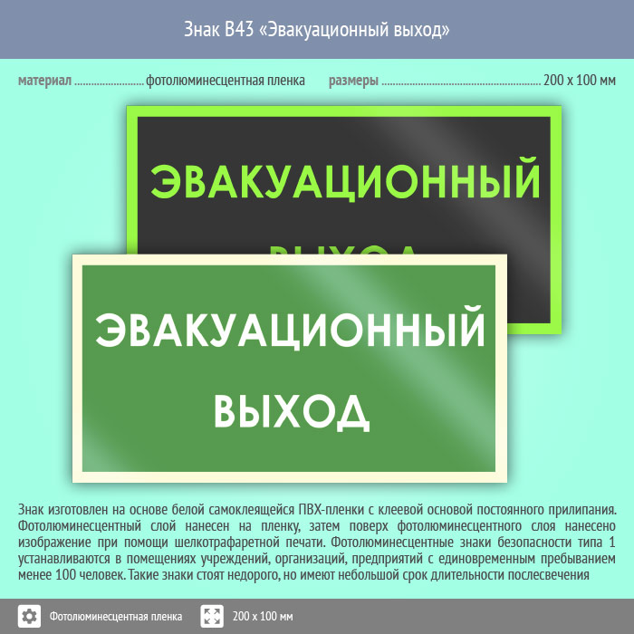 Знак B43 «Эвакуационный выход» (фотолюминесцентная пленка ГОСТ 34428-2018, 200х100 мм) в Сургуте купить