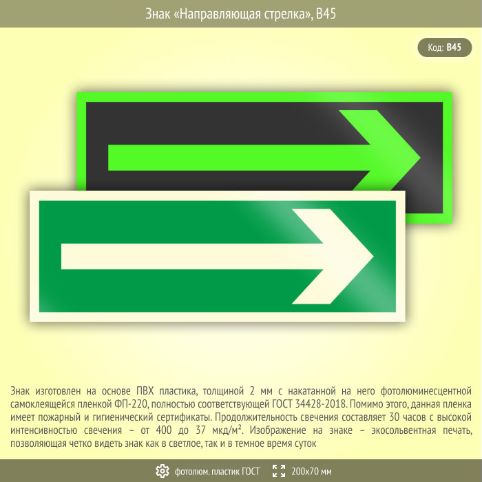 Знак «Направляющая стрелка», B45 (фотолюминесцентный пластик ГОСТ 34428-2018, 200х70 мм) в Сургуте купить