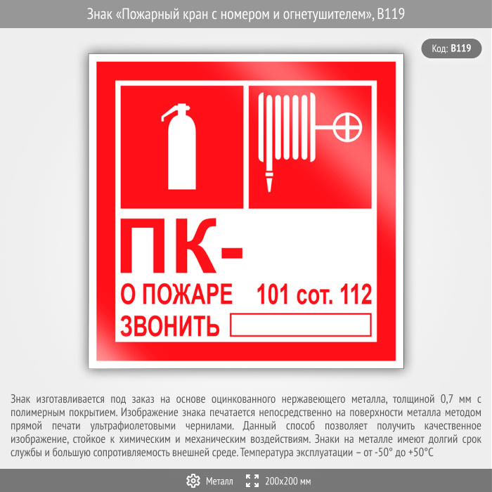 Знак «Пожарный кран с номером и огнетушителем», B119 (металл, 200х200 мм) в Сургуте купить