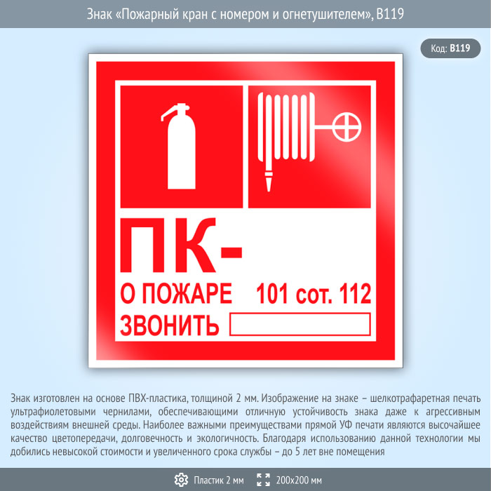 Знак «Пожарный кран с номером и огнетушителем», B119 (пластик, 200х200 мм) в Сургуте купить