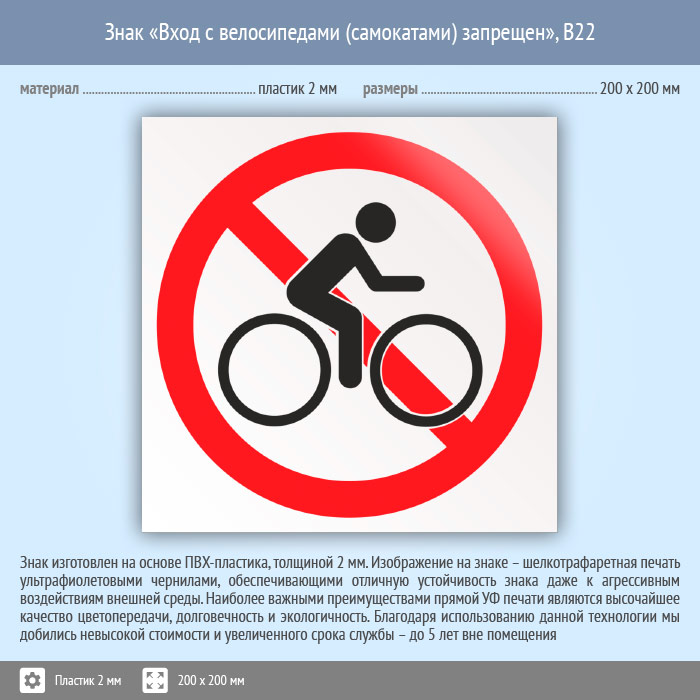 Знак «Вход с велосипедами (самокатами) запрещен», B22 (пластик, 200х200 мм) в Сургуте купить