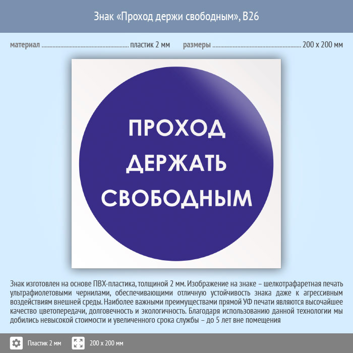 Знак «Проход держи свободным», B26 (пластик, 200х200 мм) в Сургуте купить