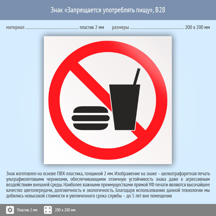Знак «Запрещается употреблять пищу», B28 (пластик, 200х200 мм) в Сургуте купить