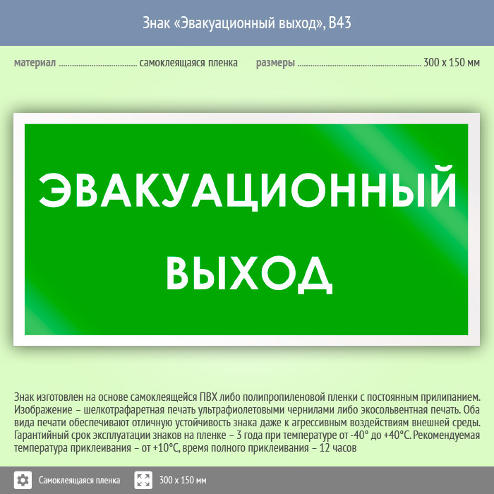 Знак «Эвакуационный выход», B43 (пленка, 300х150 мм) в Сургуте купить